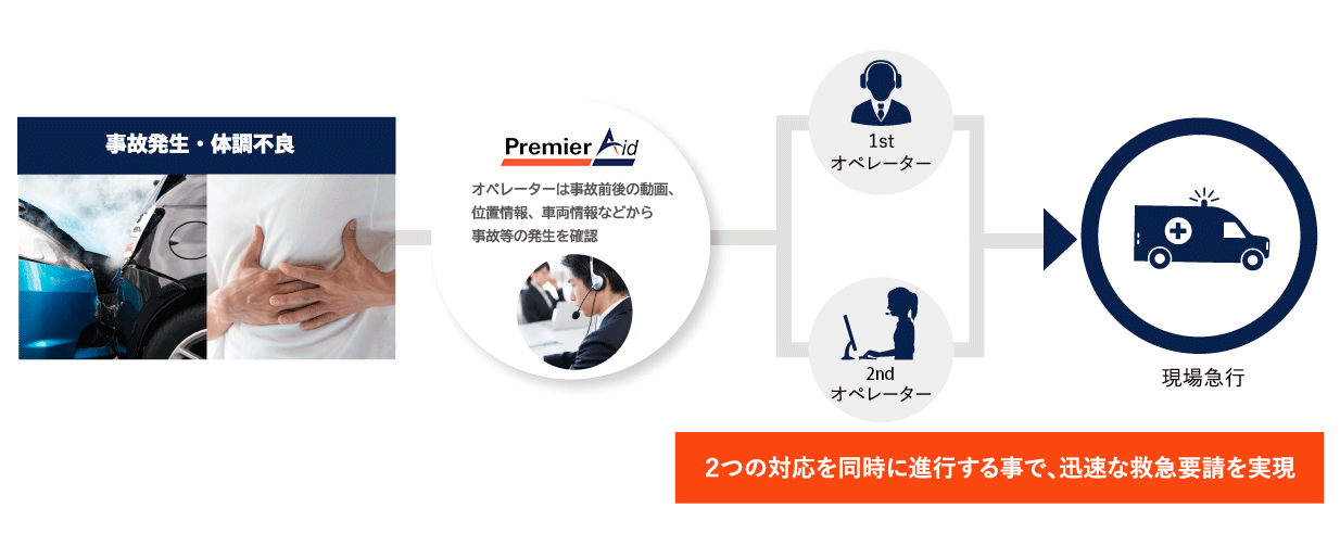 意識を失うなど自力で助けを呼べない状況でも、プレミア・エイドが事故発生の事実をリアルタイムで確認します。